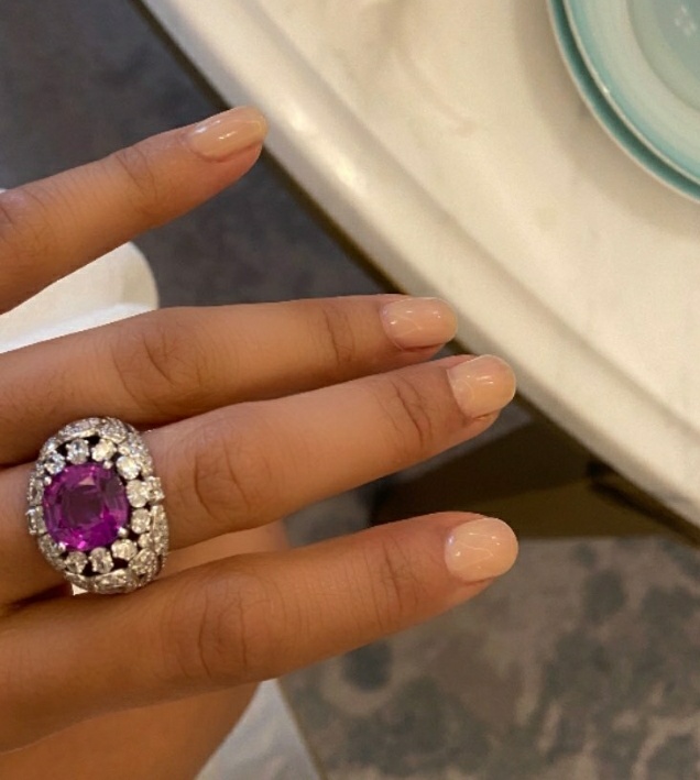 Kathryn Drysdale was dripping with beautiful Faberge Colours of Love sapphire rings at the 2021 SAG Awards. Wearing over 15 carats in total of pink and purple sapphires with white diamonds.